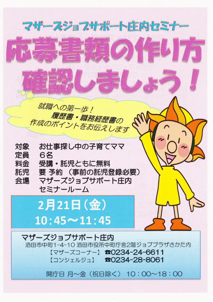 2月『マザーズジョブサポート庄内 求職支援セミナー』『応募書類の作り方確認しましょう!』を行います! このセミナーは就職への第一歩!履歴書・職務経歴書のポイントをお伝えします。 ハローワークマザーズコーナーでは定期的にセミナーを開催します。奮ってご参加下さい。受講後も疑問点など、窓口にてご相談が受けられます。☆雇用保険受給者の方は求職活動実績にカウント出来ます☆ 【日 時】2月21日(金)10時45分〜11時45分【対 象】お仕事探し中の子育てママさん【会 場】マザーズジョブサポート庄内 セミナールーム【料 金】受講料 及び 託児料 無料【定 員】先着6名※お申込みが必要です。【託 児】定員6名※事前登録・予約が必要です。※併設の保育ルームで、保育スタッフがお子さんをお預かりします。ママは安心して受講いただけます。 【駐車場について】お車でお越しの際は、中町庁舎脇にある〈セントラルホテル契約駐車場〉をご利用ください。(ジョブプラザさかたと表示してあります。)※契約駐車場が満車の場合は、酒田市中央地下駐車場をご利用ください。酒田市中央地下駐車場をご利用の方は、無料駐車券を(最大2時間まで)発行いたします。お帰りの際に、マザーズ窓口へお声がけください。 どうぞ、お気軽にお問い合わせくださいね。 ◇お申込み・お問い合わせ◇マザーズジョブサポート庄内TEL:0234-24-6611(マザーズコーナー)TEL:0234-28-8061(コンシェルジュコーナー)開庁日 月〜金(祝日除く)10:00〜18:00