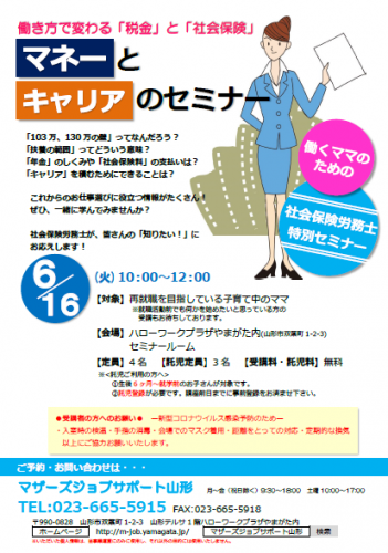 社会保険労務士を講師に招いて「マネー」と「キャリア」のセミナーを開催します! ・「扶養の範囲内で働く」とはどういうこと?・働くママの「年金」や「社会保険」はどうなる?・キャリアを積むために今できることは? これから、自分の働き方を決めるために知っておきたいお金のことについて、キャリアアップできる働き方について、必要な情報をお伝えします。 ●ご利用の方へお願い●新型コロナウイルス感染予防のため・入室時の検温・手指の消毒・会場でのマスク着用・距離をとっての対応・定期的な換気以上のご協力をお願いいたします 【日時】6月16日(火) 10:00〜12:00【講師】社会保険労務士 高橋 聡子氏(さと社会保険労務士事務所)【会場】ハローワークプラザやまがた内セミナールーム【定員】4名【託児定員】3名【受講料・託児料】無料 ※お申込み数が定員に達しました。 もう申し訳ありませんが 今後はキャンセル待ちとなります。 お問い合わせは…マザーズジョブサポート山形TEL:023-665-5915