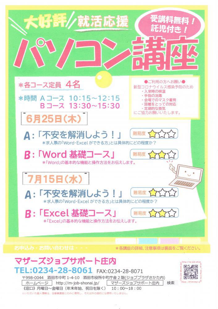 ☆マザーズジョブサポート庄内主催☆再就職応援『パソコン講座』のお知らせ ◇6月◇≪Aコース≫ 6月25日(木)10:15〜12:15『不安を解消しよう』「求人票の"パソコンが使える方"ってどの程度?」「どのくらいのパソコンのスキルが求められるの?」「WordとExcelって、どの程度使えると大丈夫?」などいろいろな不安がありますよね… パソコンについての"これから"を考えるきっかけに♪ ≪Bコース≫ 6月25日(木)13:30〜15:30『Word基礎コース』Wordを初めて使う方や、久しぶりの方を対象に基本的な機能と操作方法をお伝えします。文字入力、文書の作成や編集、表作成、印刷などを行います! ◇7月◇≪Aコース≫ 7月15日(水)10:15〜12:15『不安を解消しよう』「求人票の"パソコンが使える方"ってどの程度?」「どのくらいのパソコンのスキルが求められるの?」「WordとExcelって、どの程度使えると大丈夫?」などいろいろな不安がありますよね… パソコンについての"これから"を考えるきっかけに♪ ≪Bコース≫ 7月15日(水)13:30〜15:30『Excel基礎コース』Excelを初めて使う方や、久しぶりの方を対象に基本的な機能と操作方法をお伝えします。表の作成や編集、関数による計算、グラフの作成などを行います! ♪片方のコースのみ、両方のコース、どちらの受講でも可能です♪※本セミナーは「雇用保険受給中の求職活動実績」として認められます。 ★★受講者の皆様へお願い★★新型コロナウイルス拡大防止のため、・入室時の検温・手指の消毒・会場でのマスク着用・距離をとっての対応・定期的な換気にご協力お願いいたします。★★ーーーーーーーーーーーー★★【対 象】就職を目指している子育て中のママ※就職活動前で何かを始めたい方でもOK【会 場】マザーズジョブサポート庄内 セミナールーム【料 金】受講料 及び 託児料 無料【定 員】先着4名 ※お申込みが必要です。【託 児】定員4名 ※事前登録・予約が必要です。 【駐車場について】お車でお越しの際は、中町庁舎脇にある〈セントラルホテル契約駐車場〉をご利用ください。(ジョブプラザさかたと表示してあります。)※契約駐車場が満車の場合は、酒田市中央地下駐車場をご利用ください。無料駐車券(最大2時間)を発行いたします。お帰りの際に、コンシェルジュ窓口へお声がけください。 ◇お申込み・お問い合わせ◇マザーズジョブサポート庄内TEL:0234-28-8061
