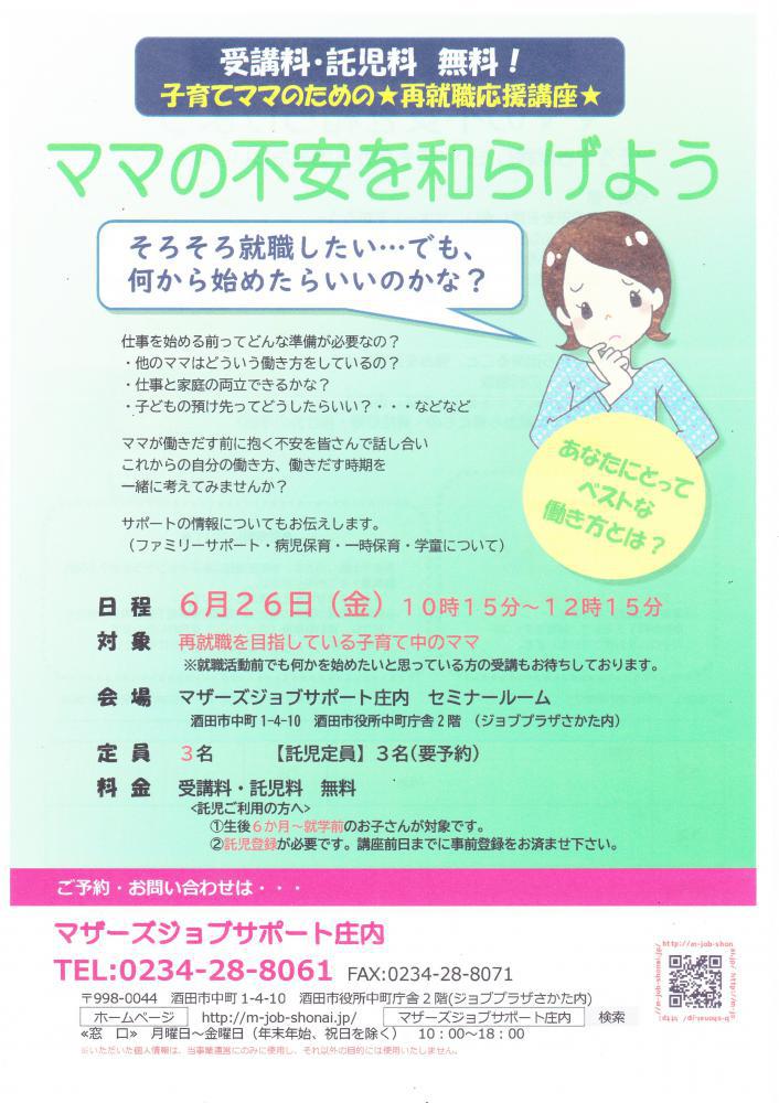 仕事を始める前ってどんな準備が必要なのでしょうか。「他のママはどういう働き方をしているの?」「仕事と家庭の両立はできるかな?」「子どもの預け先はどうしたらいい?」などママが働き出す前に抱く不安をみなさんで話し合い、これからの自分の働き方、働き出す時期を一緒に考えてみませんか?働くママの体験談や、サポート施設の情報もお伝えします。 ★★受講者の皆様へお願い★★新型コロナウイルス拡大防止のため、・入室時の検温・手指の消毒・会場でのマスク着用・距離をとっての対応・定期的な換気にご協力お願いいたします。★★ーーーーーーーーーーーー★★ 【日 時】6月26日(金)10時15分〜12時15分 【対 象】就職を目指している子育て中のママ※就職活動前で何かを始めたい方でもOK【会 場】マザーズジョブサポート庄内 セミナールーム【料 金】受講料 及び 託児料 無料【定 員】先着3名 ※お申込みが必要です。【託 児】定員3名 ※事前登録・予約が必要です。※併設の保育ルームで、保育スタッフがお子さんをお預かりします。ママは安心して受講いただけます。 ※本セミナーは「雇用保険受給中の求職活動実績」として認められます。 【駐車場について】お車でお越しの際は、中町庁舎脇にある〈セントラルホテル契約駐車場〉をご利用ください。(ジョブプラザさかたと表示してあります。)※契約駐車場が満車の場合は、酒田市中央地下駐車場をご利用ください。無料駐車券(最大2時間)を発行いたします。 どうぞ、お気軽にお問い合わせくださいね。 ◇お申込み・お問い合わせ◇マザーズジョブサポート庄内TEL:0234-28-8061