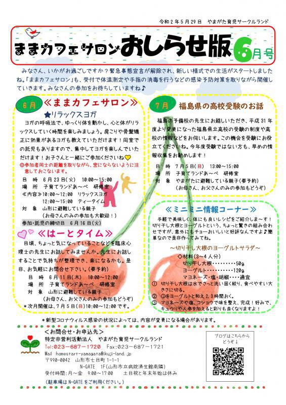 みなさん、こんにちは!初夏の風が心地よい季節となりましたが、いかがお過ごしですか?6月のままカフェサロンとはーとタイムの予定をご案内しま〜す体温測定や手指の消毒など感染対策を取りながら開催していきます。みなさんの参加をお待ちしていますね♪ ≪ままカフェサロンのお知らせ≫ 今月は、リラックスヨガを行いま〜すヨガの呼吸法でゆっくり体を動かし、心と体がリラックスしていく時間を楽しみましょう。肩こりや骨盤矯正に効果があるヨガも教えていただけます!見守り託児もありますので、集中してヨガを楽しんでくださいね。日時:6月23日(火)10:00〜15:00場所:子育てランドあ〜べ研修室 10:00〜12:00 リラックスヨガ ◆参加や託児をご希望の方は、6月16日(火)までご予約下さい。 ◎参加者同士の距離を取りながら、密にならないように注意して行います。 12:00〜15:00 ティータイム ◆予約は必要ありません。気軽にご参加ください。 ≪はーとタイムのお知らせ≫ ちょっと不安に思っていること、もやもやしていることなど、臨床心理士の先生に気軽に相談してみませんか。話をすることで気持ちが整理できることもあるかも。(要予約)日時:6月11日(木)10:00〜12:00場所:子育てランドあ〜べ 研修室対象:山形に避難している親子 (お母さん、お父さんのみの参加もどうぞ) ◆ご希望の方は、6月10日までご予約下さい。 ≪翌月の予定≫〜ままカフェサロン〜7月5日(日)13:00〜15:00「福島県の高校受験のお話」 講師:尚志学園福島高等予備校 福島校 教頭 伊藤哲先生 場所:子育てランドあ〜べ 研修室 *昨年度から変更になった福島県公立高校の受験の制度や 高校の情報など、福島の予備校の先生にお伺いします! この機会を受験にお役立てくだ下さいね。〜はーとタイム〜7月5日(日)10:00〜12:00 子育てランドあ〜べ 研修室*新型コロナウィルスの感染状況等により、変更になる場合もあります。 【お問合せ・お申込先】やまがた育児サークルランドTEL023-687-1720
