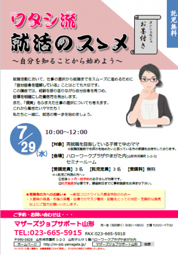 コンシェルジュセミナー「ワタシ流 就活のスゝメ 〜自分を知ることから始めよう〜」を開催します! 就職活動において「自分を理解していること」はとても大切です。これまでの経験を振り返ることで自分自身を見つめ直し「目標を明確にした働き方」を一緒に探してみませんか?ここからが、就活の第一歩です! ●ご利用の方へお願い●新型コロナウイルス感染予防のため・入室時の検温・手指の消毒・会場でのマスク着用・距離をとっての対応・定期的な換気以上のご協力をお願いいたします 【日時】7月29日(水)10:00〜12:00 【会場】ハローワークプラザやまがた内セミナールーム 【定員】3名 【託児定員】3名 【受講料・託児料】無料 ※新型コロナウイルス対策のため 定員を通常の半数にさせていただきます。 お早目のお申込みをおすすめいたします。 お問い合わせは…マザーズジョブサポート山形TEL:023-665-5915