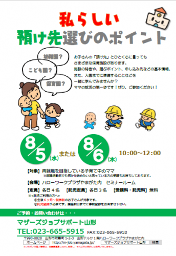 コンシェルジュセミナー「私らしい 預け先選びのポイント」を開催します! お子さんの「預け先」と言ってもさまざまな保育施設があります。各施設の特色や選ぶときに気になるポイント申込み先について入園までに準備すること などなど基本的で具体的な内容を、一緒に学びましょう! ●ご利用の方へお願い●新型コロナウイルス感染予防のため・入室時の検温・手指の消毒・会場でのマスク着用・距離をとっての対応・定期的な換気以上のご協力をお願いいたします 【日時】8月5日(水) または6日(木)10:00〜12:00※都合の良い日をお選びください 内容は同じです 【会場】ハローワークプラザやまがた内セミナールーム 【定員】各日4名 【託児定員】各日3名 【受講料・託児料】無料 ※新型コロナウイルス対策のため 定員を通常の半数にさせていただきます。 お早目のお申込みをおすすめいたします。 お問い合わせは…マザーズジョブサポート山形TEL:023-665-5915