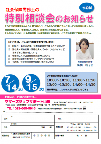 マザーズジョブサポート山形では社会保険労務士の先生をお招きして特別個別相談会を行っています。 たとえば、こんなご相談をお受けします!@「103万、130万円の壁」、「扶養の範囲内で働く」 ということとは?A正社員、契約社員、派遣社員、パート、アルバイト… 私に合った働き方とは?B「年金」のしくみと「社会保険」の給付についてC資格や経験を活かすキャリアアップについて ママたちのご質問にお答えします。 【日程】7月14日(火)9月15日(火) 【時間】10:00〜10:5011:00〜11:5013:00〜13:5014:00〜14:50 【担当】社会保険労務士 高橋 聡子氏 【場所】マザーズジョブサポート山形コンシェルジュ相談窓口 お一人、50分程度のご相談時間です。ご相談のあいだ、託児のご利用もできます。 予約制になっておりますのでご相談ご希望の方は、マザーズジョブサポート山形までお気軽にお問合せください。 お問合せ、ご予約は…マザーズジョブサポート山形TEL:023-665-5915