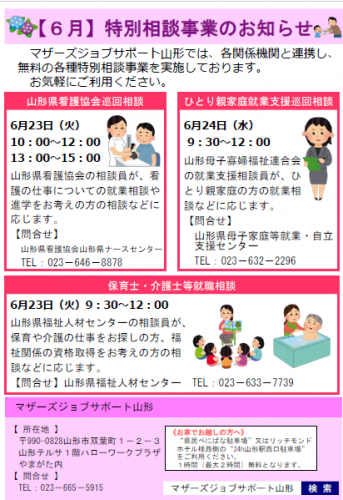 マザーズジョブサポート山形では、各関係機関と連携し、各種特別相談事業を実施しております。是非、ご利用ください。 ひとり親家庭就業支援相談 日時 6月24日(水) 9:30〜12:00場所 ハローワークプラザやまがた内 セミナールーム問合せ 山形県母子家庭等就業・自立支援センターTEL:023-632-2296HP:http://www.y-boshi.com/self-support/ひとり親家庭の方や今後について考えている方、どうぞお気軽にお越しください。 保育士・介護士等就職相談 日時 6月23日(火) 9:30〜12:00場所 ハローワークプラザやまがた内 マザーズジョブサポート山形問合せ 山形県福祉人材センターTEL:023-633-7739HP:http://www.ymgt-shakyo.or.jp/jinzai/ 保育士・介護士・看護師など資格をお持ちの方や、資格取得を目指している方、福祉職にご関心のある方はお気軽にお越しください。 山形県看護協会巡回相談 日時 6月23日(火) @10:00〜12:00 A13:00〜15:00 場所 ハローワークプラザやまがた内 セミナールーム問合せ 山形県看護協会TEL:023-646-8878HP:http://www.nurse-yamagata.or.jp/ 看護の仕事への復職をお考えの方、お気軽にご相談ください ※ご利用ご希望の方は、 マザーズジョブサポート山形まで お問合せください。 ご相談の際の、お子さまの託児は 「保育ルーム にこにこ」をご利用いただけます。 (託児はご予約が必要です) お問い合わせは…マザーズジョブサポート山形TEL:023−665−5915