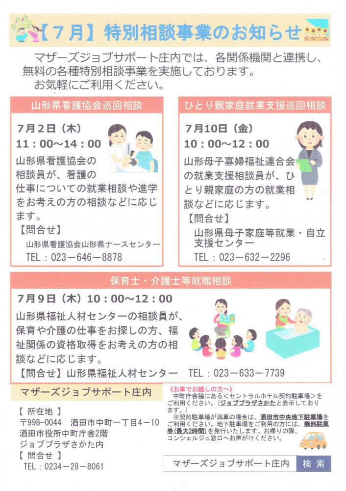 マザーズジョブサポート庄内では、各関係機関と連携し、各種特別相談事業を実施しております。ぜひ、ご利用ください。 山形県看護協会巡回相談 ※お申し込み不要日時 7月2日(木)11:00〜14:00場所 マザーズジョブサポート庄内 セミナールーム問合せ 山形県看護協会 пF023-646-8878HP:http://www.nurse-yamagata.or.jp/ 看護の仕事への復職をお考えの方、お気軽にご相談ください。 保育士・介護士等就職相談 ※お申し込み不要日時 7月9日(木)10:00〜12:00場所 マザーズジョブサポート庄内 セミナールーム問合せ 山形県福祉人材センター пF023-633-7739HP:http://www.ymgt-shakyo.or.jp/jinzai/保育士・介護士・看護師など資格をお持ちの方や、資格取得を目指している方、福祉職にご関心のある方は、お気軽にお越しください。 ひとり親家庭就業支援相談 [要予約]日 時 7月10日(金)10:00〜12:00場 所 マザーズジョブサポート庄内 セミナールーム問合せ 山形県母子家庭等就業・自立支援センター пF023-632-2296HP:http://www.y-boshi.com/self-support/ひとり親家庭の方や今後について考えている方、どうぞお気軽にお越しください。 ※各相談会について、利用ご希望の方は、マザーズジョブサポート庄内までお気軽にお声掛けください。※ご相談の際、お子さまの託児は『保育ルーム きらきら』をご利用いただけます。託児ルームのご利用には、事前のご登録が必要です。 【駐車場について】お車でお越しの際は、中町庁舎脇にある〈セントラルホテル契約駐車場〉をご利用ください。(ジョブプラザさかたと表示してあります。)※契約駐車場が満車の場合は、酒田市中央地下駐車場をご利用ください。無料駐車券(最大2時間)を発行いたします。お帰りの際に、コンシェルジュ窓口へお声がけください。 ◇お申込み・お問い合わせ◇マザーズジョブサポート庄内TEL:0234-28-8061