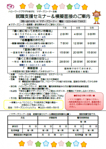 2020年、7月から9月までのマザーズ就職支援セミナー と模擬面接のお知らせ です! 【マザーズ就職支援セミナー】 マザーズコーナー(ハローワーク)のスタッフが、 毎月4つのテーマでご説明します。 ★『働く前に知っておきたい労働法』「賃金支払いのルールって?」「社会保険や雇用保険の加入条件は?」「育休は正社員じゃなくても取れる?」etc.求人票の項目に沿って、基本的なことをご説明します。【日時】7月2日(木)8月4日(火)9月3日(木) ★『応募書類の作り方』履歴書・職務経歴書・添え状…書き方に不安はありませんか?基本的な記載方法からマザーズ向けの好事例など分かり易くご説明します。【日時】7月7日(火)8月12日(水)9月9日(水) ★『面接の受け方』「書類は通るけど面接が…」や「面接は苦手…」と思われている方基本的なマナーや面接の流れを説明いたします。短時間ですが、参加された皆さんと一緒に入室・退室も練習予定です。【日時】7月15日(水)8月20日(木)9月15日(火) ★『働くときの保険のはなし』雇用保険、社会保険(健康保険、厚生年金)を加入する基準とは?よく耳にする「扶養の範囲内」で働くとどうなるの?働くときの保険について、基本的なことをご説明します。[日時]7月28日(火)8月26日(水)9月30日(水) ◎ 開場はいずれも ハローワークプラザやまがた内 セミナールーム◎ 時間はいずれも 11:00〜11:45◎ 託児:無料(事前予約が必要)◎ 定員:3名(先着順)◎申込み方法:申込書をマザーズコーナー窓口に ご提出いただくか、 お電話でご連絡ください。※キャンセルの場合も事前にご連絡ください。◎持ち物:ハローワークカード、筆記用具※雇用保険受給中の方は雇用保険受給資格者証 【マザーズ模擬面接】スーツ着用で臨んでいただく本番面接を想定した面接です。ご希望の日時で事前にご予約ください。◎会場 ハローワークプラザやまがた内 セミナールーム◎託児 無料(事前予約が必要)◎持ち物 ハローワークカード、筆記用具 履歴書の写 ※雇用保険受給中の方は雇用保険受給資格者証 お問い合わせはハローワークプラザやまがたTEL:023-646-7360 託児ご利用の方はマザーズジョブサポート山形までお問合せくださいTEL:023-665-5915