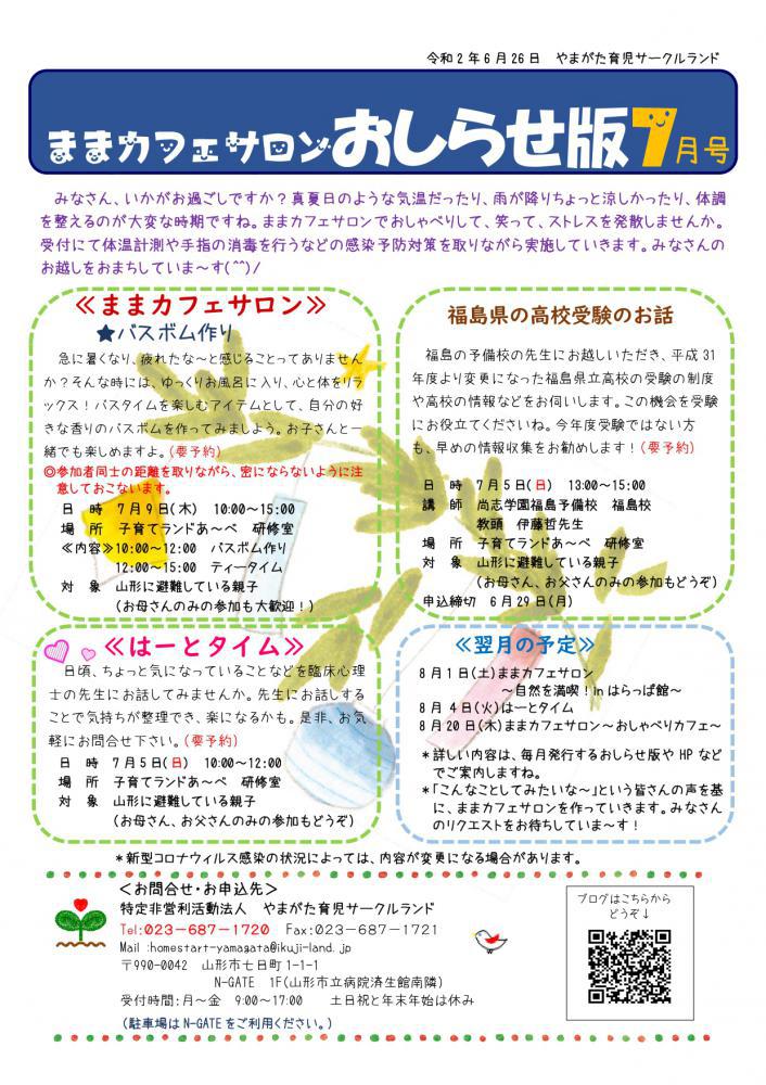 みなさん、こんにちは!真夏日の気温だったり、雨が降りちょっと涼しかったり、体調を整えるのが大変な時期ですが、いかがお過ごしですか?ままカフェサロンで、おしゃべりをして、笑って、ストレスを発散しませんか。7月のままカフェサロンとはーとタイムの予定をご案内しますね体温測定や手指の消毒など感染対策を取りながら開催していきます。みなさんの参加をお待ちしていますね♪ ≪ままカフェサロンのお知らせ≫今月は、バスボム作りを行いま〜す急に暑くなり、疲れたな〜と感じることはありませんか?そんな時は、ゆっくりとお風呂に入ると疲れが取れたりしますよね。バスタイムを楽しむアイテムとして、一緒にバスボムを作ってみましょう。自分の好きな香りのバスボムは、きっと疲れた体を癒してくれますよ♪ 日時:7月9日(木)10:00〜15:00場所:子育てランドあ〜べ研修室10:00〜12:00 バスボム作り(要予約) ◆材料は、こちらでご用意します。汚れても良い服装でお越し下さい。◎参加者同士の距離を取りながら、密にならないように注意して行います。 12:00〜15:00 ティータイム◆予約は必要ありません。気軽にご参加ください。 ≪はーとタイムのお知らせ≫ちょっと不安に思っていること、もやもやしていることなど、臨床心理士の先生に気軽に相談してみませんか。話をすることで気持ちが整理できることもあるかも。(要予約)日時:7月5日(土)10:00〜12:00場所:子育てランドあ〜べ 研修室対象:山形に避難している親子 (お母さん、お父さんのみの参加もどうぞ)◆ご希望の方は、7月3日(金)までご予約下さい。 ≪福島県の高校受験のお話≫福島の予備校の先生のお越しいただき、平成31年度より変更になった福島県立高校の受験の制度や高校の情報などをお伺いします。この機会を受験にお役立て下さいね?日時:7月5日(日)13:00〜15:00場所:子育てランドあ〜べ講師:尚志学園福島予備校 福島校 教頭 伊藤哲先生対象:山形に避難している親子 (お母さん、お父さんのみの参加もどうぞ)◆参加簿希望の方は、7月3日(金)までお申込下さい。 (締切日を延長しました。) ≪翌月の予定≫〜ままカフェサロン〜8月 1日(土)10:00〜12:00〜自然を満喫!inはらっぱ館〜*蔵王みはらしの丘ミュージアムパークはらっぱ館で、思いっきり自然と触れ合いましょう。グラウンドゴルフやアイスクリーム作りにも挑戦する予定です!詳しくは、8月号でご案内しますね。8月20日(木)10:00〜15:00〜おしゃべりカフェ〜子育てランドあ〜べ研修室ににて、誰かとおしゃべりしたり、ゆっくりお茶を飲んだり、ゆったりとした時間を過ごしましょう! 〜はーとタイム〜8月4日(火)10:00〜12:00 子育てランドあ〜べ 研修室*新型コロナウィルスの感染状況等により、変更になる場合もあります。 【お問合せ・お申込先】やまがた育児サークルランドTEL023-687-1720