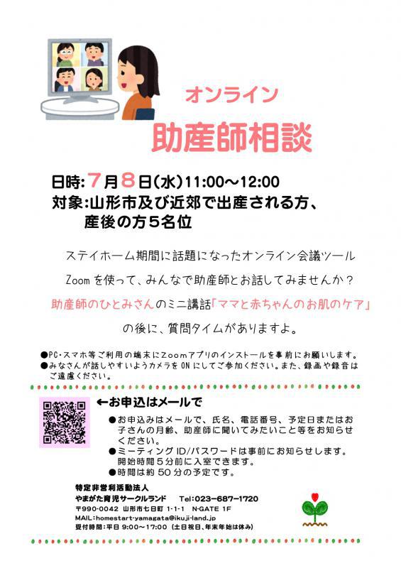 オンライン助産師相談を開催します! 今回のミニ講話は「ママと赤ちゃんのお肌のケア」です。妊娠中のお肌のケアや、赤ちゃんの虫さされ、あせも…抱っこしているママもお肌のケアは気になりますよね。助産師のひとみさんよりお話いただきます。その後は質問タイムや、参加者同士でお話しできる時間がありますよ。 オンラインでの助産師相談なので、ご自宅などの落ち着ける場所でご参加できます。 日時:7月8日(水)11:00〜12:00 (なお、10:00〜11:00はあ〜べのおやこ広場で助産師相談をしています)内容:助産師のミニ講話「ママと赤ちゃんのお肌のケア」、質問タイムなど対象:山形市及び近郊で出産される方と、産後の方 5名位 お申込はメールで、 氏名、電話番号、予定日またはお子さんの年齢、助産師に聞いてみたいこと等をお知らせください。その他、詳細は添付のチラシをご覧ください。 あ〜べのおやこ広場でも、オンラインでも♪お気軽に助産師相談にご参加ください。 やまがた育児サークルランドTEL:023-687-1720