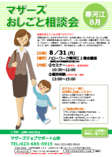 ▼マザーズおしごと相談会in寒河江 8月開催のご案内