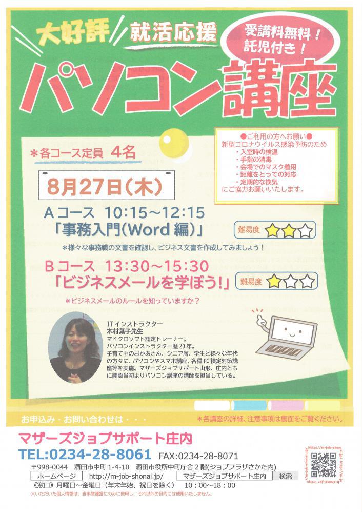 ☆マザーズジョブサポート庄内主催☆再就職応援『パソコン講座』のお知らせ ◇8月◇≪Aコース≫ 8月27日(木)10:15〜12:15『事務入門(Word編)』事務のお仕事にも、一般・経理・労務など様々です。それぞれどのようなパソコン作業があるのかを確認していきます。実際にWordを使って、ビジネス文書を作成し、印刷まで行います。*今年度からの新しいコースです。 ≪Bコース≫ 8月27日(木)13:30〜15:30『ビジネスメールを学ぼう!』ビジネスメールの基本やマナーを、実際に操作しながら学ぶことができます。仕事がスムーズに進むメールの書き方など、ビジネス上の様々なシーンで役立つ内容をお伝えします。 ♪片方のコースのみ、両方のコース、どちらの受講でも可能です♪※本セミナーは「雇用保険受給中の求職活動実績」として認められます。 ★★受講者の皆様へお願い★★新型コロナウイルス拡大防止のため、・入室時の検温・手指の消毒・会場でのマスク着用・距離をとっての対応・定期的な換気にご協力お願いいたします。★★ーーーーーーーーーーーー★★【対 象】就職を目指している子育て中のママ※就職活動前で何かを始めたい方でもOK【会 場】マザーズジョブサポート庄内 セミナールーム【料 金】受講料 及び 託児料 無料【定 員】先着4名 ※お申込みが必要です。【託 児】定員4名 ※事前登録・予約が必要です。 【駐車場について】お車でお越しの際は、中町庁舎脇にある〈セントラルホテル契約駐車場〉をご利用ください。(ジョブプラザさかたと表示してあります。)※契約駐車場が満車の場合は、酒田市中央地下駐車場をご利用ください。無料駐車券(最大2時間)を発行いたします。お帰りの際に、コンシェルジュ窓口へお声がけください。 ◇お申込み・お問い合わせ◇マザーズジョブサポート庄内TEL:0234-28-8061
