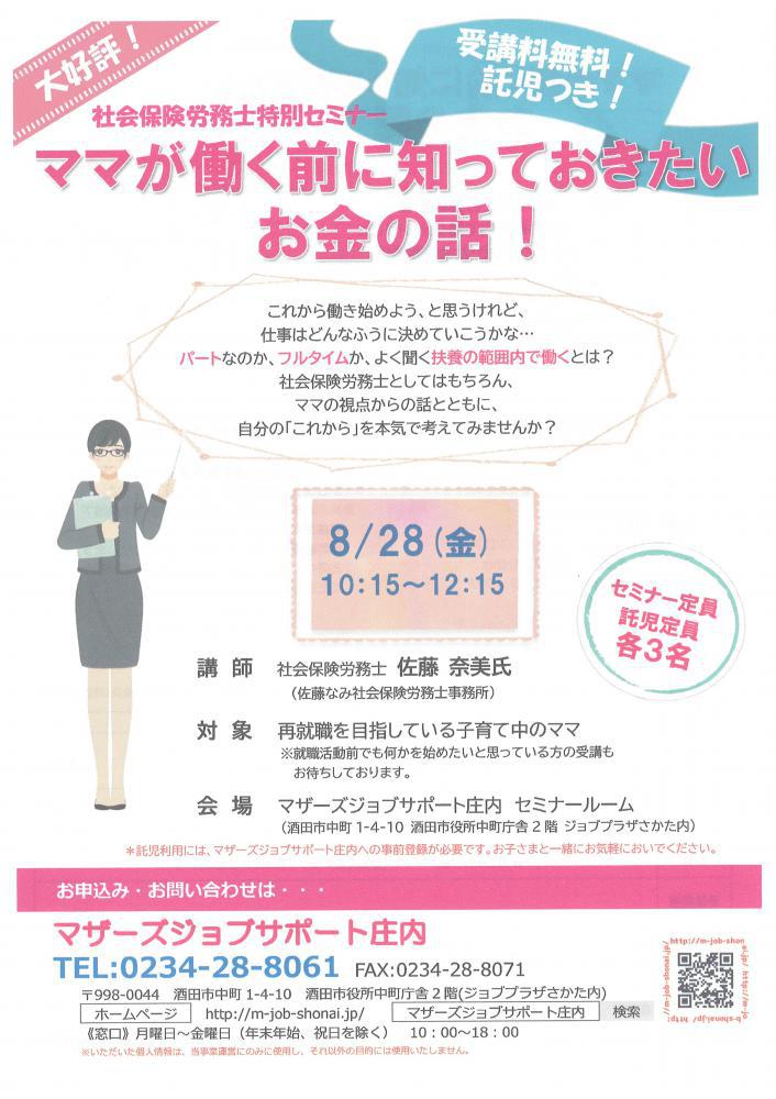 ☆ママが働く前に知っておきたいお金の話!☆ 「自分にはどんな働き方があっているのかな?」「よく聞く"扶養の範囲内で"働くって…?」プロとしてはもちろんママの視点からも語る社会保険労務士の話とともに自分の『これから』について考えてみませんか? 【日 時】8月28日(金) 10時15分〜12時15分※都合のいい日をお選びください。内容は同じ内容です。 【対 象】就職を目指している子育て中のママ※就職活動前でも何かを始めたいと思っているママもOK 【会 場】 マザーズジョブサポート庄内 セミナールーム【受講料・託児料】 無料【定 員】 先着3名【託児定員】 最大3名 ※事前にご登録と利用予約が必要です。【駐車場について】お車でお越しの際は、中町庁舎脇にある〈セントラルホテル契約駐車場〉をご利用ください。(ジョブプラザさかたと表示してあります。)※契約駐車場が満車の場合は、酒田市中央地下駐車場をご利用ください。無料駐車券(最大2時間)を発行いたします。お帰りの際に、コンシェルジュ窓口へお声がけください。 ★★受講者の皆様へお願い★★新型コロナウイルス拡大防止のため、・入室時の検温・手指の消毒・会場でのマスク着用・距離をとっての対応・定期的な換気にご協力お願いいたします。★★ーーーーーーーーーーーー★★ ◇お申込み・お問い合わせ◇マザーズジョブサポート庄内TEL:0234-28-8061