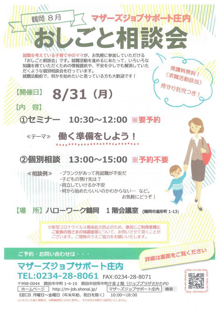 ハローワーク鶴岡『おしごと相談会』を開催します。 【日時と内容】■ 8月31日(月)10:30〜12:00 セミナー ※お申込みが必要です。「働く準備をしよう!」いざ就職活動を始めるとなると、何から始めたらよいのかわからない・・・そんなママのために、働く目的を確認し、就活の基本を学んでいきます。13:00〜15:00 個別相談会※どなたでもご利用いただけます、お申込みは不要です。・おしごとに関するお悩み・子育てに関すること・仕事と家事、子育てとの両立 など、お気軽にご相談ください。 ♪お子さんと一緒に、お気軽にお越しください♪お子さんと同じお部屋でセミナーを受講し、相談することができます。保育スタッフが、お子さんを見守ります。 ★★受講者の皆様へお願い★★新型コロナウイルス拡大防止のため、・入室時の検温・手指の消毒・会場でのマスク着用・距離をとっての対応・定期的な換気にご協力お願いいたします。★★ーーーーーーーーーーーー★★ ◇お申込み・お問合せ◇マザーズジョブサポート庄内TEL:0234-28-8061
