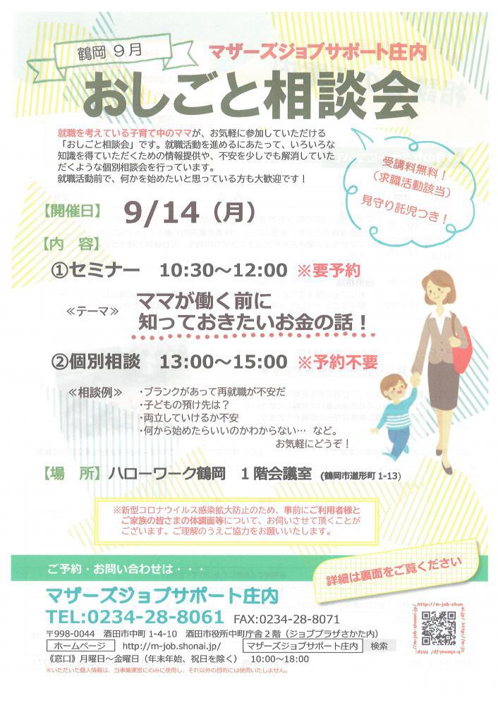 ハローワーク鶴岡『おしごと相談会』を開催します。 【日時と内容】■ 9月14日(月)10:30〜12:00 セミナー ※お申込みが必要です。「ママが働く前に知っておきたいお金の話」社会保険のことや、年金のこと、「扶養の範囲内で働く」ということなどママが今後の働き方を考える上で大切な内容を、社会保険労務士がお話します。13:00〜15:00 個別相談会※どなたでもご利用いただけます、お申込みは不要です。・おしごとに関するお悩み・子育てに関すること・仕事と家事、子育てとの両立 など、お気軽にご相談ください。 ♪お子さんと一緒に、お気軽にお越しください♪お子さんと同じお部屋でセミナーを受講し、相談することができます。保育スタッフが、お子さんを見守ります。 ★★受講者の皆様へお願い★★新型コロナウイルス拡大防止のため、・入室時の検温・手指の消毒・会場でのマスク着用・距離をとっての対応・定期的な換気にご協力お願いいたします。★★ーーーーーーーーーーーー★★ ◇お申込み・お問合せ◇マザーズジョブサポート庄内TEL:0234-28-8061