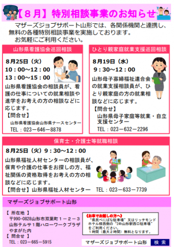 マザーズジョブサポート山形では、各関係機関と連携し、各種特別相談事業を実施しております。是非、ご利用ください。 ひとり親家庭就業支援相談 日時 8月19日(水) 9:30〜12:00場所 ハローワークプラザやまがた内 セミナールーム問合せ 山形県母子家庭等就業・自立支援センターTEL:023-632-2296HP:http://www.y-boshi.com/self-support/ひとり親家庭の方や今後について考えている方、どうぞお気軽にお越しください。 保育士・介護士等就職相談 日時 8月25日(火) 9:30〜12:00場所 ハローワークプラザやまがた内 マザーズジョブサポート山形問合せ 山形県福祉人材センターTEL:023-633-7739HP:http://www.ymgt-shakyo.or.jp/jinzai/ 保育士・介護士・看護師など資格をお持ちの方や、資格取得を目指している方、福祉職にご関心のある方はお気軽にお越しください。 山形県看護協会巡回相談 日時 8月25日(火) @10:00〜12:00 A13:00〜15:00 場所 ハローワークプラザやまがた内 セミナールーム問合せ 山形県看護協会TEL:023-646-8878HP:http://www.nurse-yamagata.or.jp/ 看護の仕事への復職をお考えの方、お気軽にご相談ください ※ご利用ご希望の方は、 マザーズジョブサポート山形まで お問合せください。 ご相談の際の、お子さまの託児は 「保育ルーム にこにこ」をご利用いただけます。 (託児はご予約が必要です) お問い合わせは…マザーズジョブサポート山形TEL:023−665−5915