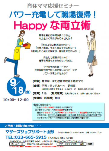 コンシェルジュセミナー「育休ママ応援セミナー パワー充電して職場復帰! Happyな両立術」を開催します! 職場を離れる時間が長くなると、なんとなく不安がありませんか?「前と同じように働けるのかな…」「仕事と家庭、うまく両立できるかな…」「復帰後に使える制度や補助について 知っておくと便利かな…」安心して復職するために!仕事も育児もあきらめないために!ママ同士の本音トークと社会保険労務士からの力強いメッセージでパワー充電しませんか? 【日時】9月18日(金)10:00〜12:00【会場】子育てランドあ〜べ 研修室*開催場所 ご注意ください【対象】育休中のママまたは、今後、育休取得予定のママ【定員】 5名【託児定員】 定員あり、お問い合わせください【受講料・託児料】 無料 ●ご利用の方へお願い●新型コロナウイルス感染予防のため・入室時の検温・手指の消毒・会場でのマスク着用・距離をとっての対応・定期的な換気以上のご協力をお願いいたします ※新型コロナウイルス対策のため 定員が通常より少なくなっております。 お早目のお申込みをおすすめいたします。 ご興味のある方はぜひ、お問合せください♪ お問い合わせは…マザーズジョブサポート山形TEL:023-665-5915