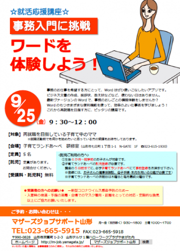 9月のパソコン講座のご案内です。 ☆就活応援講座☆『事務入門に挑戦 ワードを体験しよう!』 事務のお仕事を希望する方にとって、Wordはぜひ使いこなしたいアプリです。 最新バージョンのWordで、事務のお仕事の模擬体験をしませんか? Wordの持つ様々な便利機能を使って、効率の良い仕事術を学びましょう!これから再就職を目指す方に、ピッタリの講座です♪ 【日時】 9月25日(金) 9:30〜12:00【場所】 子育てランドあ〜べ 研修室【対象】 現在離職中で再就職を目指している 子育て中のママ【定員】 5名 【託児定員】 定員があります、お問合せくだください☆【受講料・託児料】 無料 ●ご利用の方へお願い●新型コロナウイルス感染予防のため・入室時の検温・手指の消毒・会場でのマスク着用・距離をとっての対応・定期的な換気以上のご協力をお願いいたします ※新型コロナウイルス対策のため 定員が通常より少なっております。 お早目のお申込みをおすすめいたします。 お申込み・お問い合わせは・・・マザーズジョブサポート山形TEL 023-665-5915