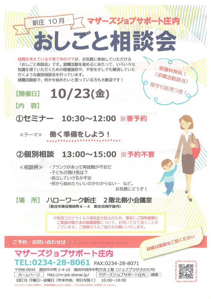 ハローワーク新庄『おしごと相談会』を開催します。 【日時と内容】■ 10月23日(金)10:30〜12:00 セミナー ※お申込みが必要です。「働く準備をしよう!」いざ就職活動を始めるとなると、何から始めたらよいのかわからない・・・そんなママのために、働く目的を確認し、就活の基本を学んでいきます。 13:00〜15:00 個別相談会※どなたでもご利用いただけますお申込みは不要です。・おしごとに関するお悩み・子育てに関すること・仕事と家事、子育てとの両立 など、お気軽にご相談ください。 ♪お子さんと一緒に、お気軽にお越しください♪お子さんと同じお部屋でセミナーを受講し、相談することができます。保育スタッフが、お子さんを見守ります。 ★★受講者の皆様へお願い★★新型コロナウイルス拡大防止のため、・入室時の検温・手指の消毒・会場でのマスク着用・距離をとっての対応・定期的な換気にご協力お願いいたします。★★ーーーーーーーーーーーー★★ ◇お申込み・お問合せ◇マザーズジョブサポート庄内TEL:0234-28-8061