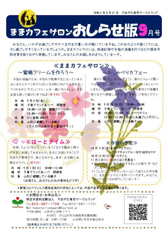 みなさん、こんにちは!まだまだ暑い日が続いていますが、いかがお過ごしですか。ままカフェサロンは、体温計測や手指の消毒を行うなどの感染予防対策を取りながら開催していきます。みなさんのお越しをお待ちしていますね♪ ≪ままカフェサロンのお知らせ≫今月は、2回開催となります「蜜蝋クリームを作ろう」、「おしゃべりカフェ」を行います。みなさんのお越しをお待ちしていま〜す 「蜜蝋クリームを作ろう」天然の蜜蝋を使った、肌にやさしいクリームを一緒に作りましょう!秋に向け、あなたのお肌を守ってくれますよ〜(要予約) 日時 9月4日(金)10:00〜15:00場所 子育てランドあ〜べ 研修室内容 10:00〜12:00 蜜蝋クリーム作り 12:00〜15:00 ティータイム会費 ひと家族300円対象 山形に避難している親子 ◎大人だけの参加も大歓迎!お友達も誘って遊びに来てね〜(^^)/ 「おしゃべりカフェ」ママ同士でワイワイ楽しくおしゃべりしませんか?お茶を用意して、お待ちしておりま〜す!日時 9月28日(月)10:00〜15:00場所 子育てランドあ〜べ 研修室内容 10:00〜12:00 おしゃべりカフェ 12:00〜15:00 ゆったりと自由にお過ごしください。対象 山形に避難している親子 ◎大人だけの参加も大歓迎! ≪はーとタイムのお知らせ≫ちょっと不安に思っていること、もやもやしていることなど、臨床心理士の先生に気軽に相談してみませんか。話をすることで気持ちが整理できることもあるかも。(要予約)日時:9月1日(火)10:00〜12:00場所:子育てランドあ〜べ 研修室対象:山形に避難している親子 (お母さん、お父さんのみの参加もどうぞ)◆ご希望の方は、8月31日(月)までご予約下さい。 ≪今後の予定≫〜ままカフェサロン〜◆10月 9日(金) 子育てランドあ〜べ 研修室 〜アロマキャンドル〜 *優しい香り、穏やかなキャンドルの光があなたを癒してくれます! 秋の夜長にぴったりなアイテムです。◆11月3日(火・祝)わくほこ芋煮会 詳細は、次月のおしらせ版やHPなどでご案内しますね。 〜はーとタイム〜◆10月18日(日)10:00〜12:00 子育てランドあ〜べ 研修室 *新型コロナウィルスの感染状況等により、変更になる場合もあります。 【お問合せ・お申込先】やまがた育児サークルランドTEL023-687-1720