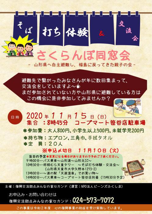 山形県へ自主避難し、福島に戻ってきた親子の会である「さくらんぼ同窓会」が、今回は天童市で開催されます!!山形に避難をしている方も参加していただけますよ(^^)/ そば打ちに挑戦したり、気軽におしゃべりしたり、一緒に楽しい時間を過ごしましょう!!帰福をお考えの方は、帰福者との交流を通し生の情報をGETできますよ〜(^_-)是非ご参加くださいね♪参加の際は、マスクの着用や検温や手指消毒などへのご協力をお願いします。みなさんのお越しをお待ちしていま〜す! 「さくらんぼ同窓会〜そば打ち体験&交流会〜」日 時:2020年11月15日(日)10時30分〜13時場 所:将棋むら天童タワー(山形県天童市大字久野本1273-2)内 容:そば打ち体験・交流会参加費:大人800円、小学生以上500円、未就学児200円持ち物:エプロン、三角巾、手ぬぐいタオル定 員:20名申込締切:11月10日(火)*さくらんぼ同窓会は山形県へ自主避難し、福島に戻ってきた親子の会で避難先でつな がった皆さんが年に数回集まって交流会をしているものです。*福島から参加の方は、貸切バスをご利用いただけます。詳しくは、復興交流拠点みん なの家セカンドまでお問い合わせください。 お申込・お問合せ先 ◆復興交流拠点みんなの家セカンド( 024-573-7072) ◆やまがた育児サークルランド( 023-687-1720)