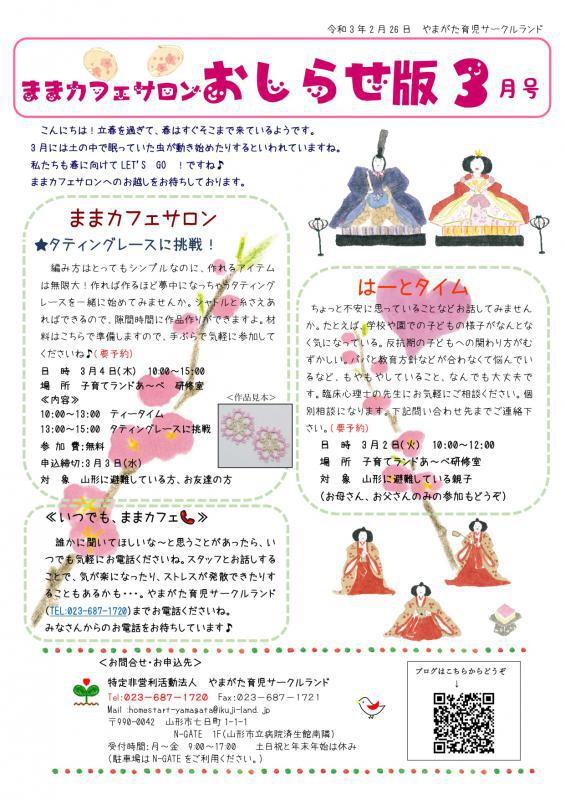 皆さん、こんにちは〜立春が過ぎて、「春はすぐそこまで来ている!!」いと言いたいところですが、まだまだ寒い日が続いていますね〜。いかがお過ごしですか。3月に入ればぐっと春めいてくるはず!!元気に春を迎えましょうえね?ままカフェサロンへのお越しをお待ちしておりま〜す。 ≪ままカフェサロンのお知らせ≫「タティングレースに挑戦!」編み方はとってもシンプルなのに、作れるアイテムは無限大。作れば作るほど夢中になっちゃうタティングレースを一緒に始めてみませんか。材料はこちらで準備しますので、手ぶらで気軽に参加してくださいね。(要申込)日時 3月4日(木)10:00〜15:00場所 こそだて子育てランドあ〜べ 研修室内容 10:00〜13:00 ティータイム13:00〜15:00 タティングレースに挑戦!参加費:無料対象:山形に避難している方、お友達の方◎参加ご希望の方は、3月3日(水)までご予約下さい。 ≪はーとタイムのお知らせ≫今回は、電話やオンラインで相談をお受けいただけます。ちょっと不安に思っていること、もやもやしていることなど、臨床心理士の先生に気軽に相談してみませんか。話をすることで気持ちが整理できることもあるかも。(要予約、まずはお電話ください)日時:3月2日(火)10:00〜12:00場所:子育てランドあ〜べ 研修室対象:山形に避難している親子 (お母さん、お父さんのみの申込もどうぞ)◎相談ご希望の方は、3月1日(月)15:00までご予約下さい。 【お問合せ・お申込先】やまがた育児サークルランドTEL023-687-1720