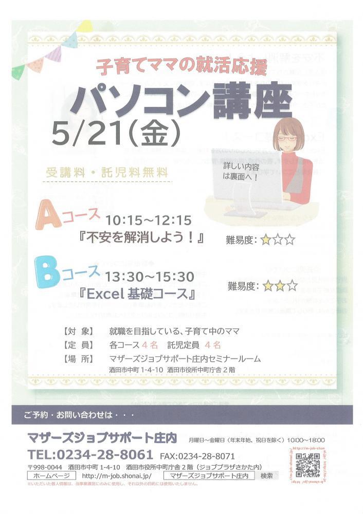 ☆マザーズジョブサポート庄内主催☆再就職応援『パソコン講座』のお知らせ ≪Aコース≫ 5月21日(金)10:15〜12:15『不安を解消しよう!』難易度:★「求人票の"パソコンが使える方"ってどの程度?」「仕事では、どのくらいのスキルが求められるの?」「WordとExcelって、どの程度使えると大丈夫?」などいろいろな不安がありますよね… パソコンについての"これから"を考えるきっかけに♪ ≪Bコース≫ 5月21日(金)13:30〜15:30『Excel基礎コース』難易度:★★Excelを初めて使う方や、久しぶりの方を対象に基本的な機能と操作方法をお伝えします。表の作成や編集、関数による計算、グラフの作成などを行います! ♪片方のコースのみ、両方のコース、どちらの受講でも可能です♪※本セミナーは「雇用保険受給中の求職活動実績」として認められます。 ★★受講者の皆様へお願い★★新型コロナウイルス拡大防止のため、・入室時の検温・手指の消毒・会場でのマスク着用・距離をとっての対応・定期的な換気にご協力お願いいたします。★★ーーーーーーーーーーーー★★【対 象】就職を目指している子育て中のママ※就職活動前で何かを始めたいママもOK【会 場】マザーズジョブサポート庄内 セミナールーム【料 金】受講料 及び 託児料 無料【定 員】先着4名 ※お申込みが必要です。【託 児】定員4名 ※事前登録・予約が必要です。 【駐車場について】お車でお越しの際は、中町庁舎脇にある〈セントラルホテル契約駐車場〉をご利用ください。(ジョブプラザさかたと表示してあります。)※契約駐車場が満車の場合は、酒田市中央地下駐車場をご利用ください。無料駐車券(最大2時間)を発行いたします。お帰りの際に、コンシェルジュ窓口へお声がけください。 ◇お申込み・お問い合わせ◇マザーズジョブサポート庄内TEL:0234-28-8061