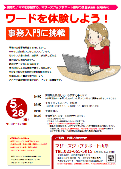 5月のパソコン講座のご案内です。 『ワードを体験しよう!事務入門に挑戦』 事務のお仕事を希望する方にとって、Wordはぜひ使いこなしたいアプリです。 最新バージョンのWordで、事務のお仕事の模擬体験をしませんか? Wordの持つ様々な便利機能を使って、効率の良い仕事術を学びましょう!これから再就職を目指す方に、ピッタリの講座です♪ ★ご注意★ 会場の、子育てランドあ〜べが 山形市内在住の方のご利用に限定している為 今月のお申込みは、山形市内在住の方に 限らせていただきます。 【日時】 5月28日(金) 9:30〜12:00【場所】 子育てランドあ〜べ 研修室【対象】 現在離職中で再就職を目指している 子育て中のママ【定員】 8名 【託児定員】 定員があります、お問合せくだください☆【受講料・託児料】 無料 ●ご利用の方へお願い●新型コロナウイルス感染予防のため・入室時の検温・手指の消毒・会場でのマスク着用・距離をとっての対応・定期的な換気以上のご協力をお願いいたしますまた、新型コロナウイルス感染症の影響により中止または延期、会場の変更となる場合がございます。あらかじめ、ご了承ください。 お申込み・お問い合わせは・・・マザーズジョブサポート山形TEL 023-665-5915