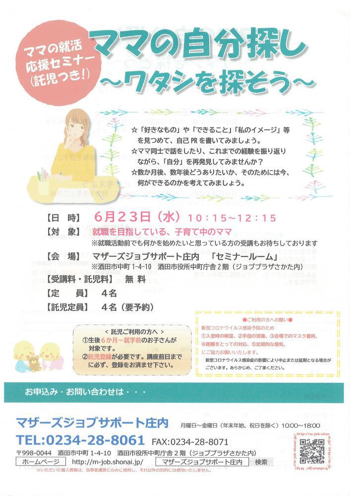 ☆マザーズジョブサポート庄内主催☆『ママの自分探し〜ワタシを探そう〜』のお知らせです。 「ママの自分探し〜ワタシを探そう〜」自分自身のことを理解することからお仕事探しはスタートします。得意なこと、苦手なこと、長所と短所など、自分の棚卸しをして、「ワタシをアピールできること」を見つけましょう ★★受講者の皆様へお願い★★新型コロナウイルス拡大防止のため、・入室時の検温・手指の消毒・会場でのマスク着用・距離をとっての対応・定期的な換気にご協力お願いいたします。新型コロナウイルス感染症の影響により中止または延期となる場合がございます。あらかじめ、ご了承ください。★★ーーーーーーーーーーーー★★【日 時】6月23日(水)10時15分〜12時15分 【対 象】就職を目指している子育て中のママ※就職活動前で何かを始めたい方でもOK【会 場】マザーズジョブサポート庄内 セミナールーム【料 金】受講料 及び 託児料 無料【定 員】先着4名 ※お申込みが必要です。【託 児】定員4名 ※事前登録・予約が必要です。※併設の保育ルームで、保育スタッフがお子さんをお預かりします。ママは安心して受講いただけます。※本セミナーは「雇用保険受給中の求職活動実績」として認められます。 【駐車場について】お車でお越しの際は、中町庁舎脇にある〈セントラルホテル契約駐車場〉をご利用ください。(ジョブプラザさかたと表示してあります。)※契約駐車場が満車の場合は、酒田市中央地下駐車場をご利用ください。無料駐車券(最大2時間)を発行いたします。 どうぞ、お気軽にお問い合わせくださいね。 ◇お申込み・お問合せ◇マザーズジョブサポート庄内TEL:0234-28-8061