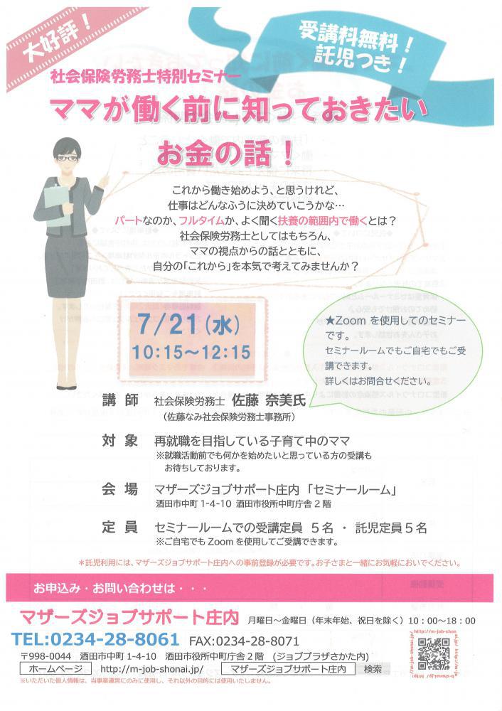 ☆ママが働く前に知っておきたいお金の話!☆ 「自分にはどんな働き方があっているのかな?」「よく聞く"扶養の範囲内で"働くって…?」プロとしてはもちろんママの視点からも語る社会保険労務士の話とともに自分の『これから』について考えてみませんか? 【日 時】7月21日(水) 10時15分〜12時15分 【対 象】就職を目指している子育て中のママ※就職活動前でも何かを始めたいと思っているママもOK 【会 場】 マザーズジョブサポート庄内 セミナールーム酒田市中町1-4-10酒田市役所中町庁舎2階または ご自宅でオンライン受講(Zoom)【受講料・託児料】 無料【定 員】 @セミナールームでの受講のみ(定員5名)Aオンラインでの受講は随時受け付けております※@の場合は託児もご利用いただけます。【託児定員】 定員5名 ※事前にご登録と利用予約が必要です。【駐車場について】お車でお越しの際は、中町庁舎脇にある〈セントラルホテル契約駐車場〉をご利用ください。(ジョブプラザさかたと表示してあります。)※契約駐車場が満車の場合は、酒田市中央地下駐車場をご利用ください。無料駐車券(最大2時間)を発行いたします。お帰りの際に、コンシェルジュ窓口へお声がけください。 ★セミナールームご利用の皆様へお願い★新型コロナウイルス拡大防止のため、・入室時の検温・手指の消毒・会場でのマスク着用・距離をとっての対応・定期的な換気にご協力お願いいたします。新型コロナウイルス感染症の影響により中止または延期となる場合がございます。あらかじめ、ご了承ください。★★ーーーーーーーーーーーーーーーー★★●ご自宅でオンライン受講ご利用の方へ●・インターネット環境が必要になります。 通信料は自己負担です。・パソコン、スマートフォン、 またはたタブレットをご準備いただき、 事前にZoom meetingを ダウンロードしてください。・セミナー中はカメラをオンにし、 お顔の見える状態で受講して下さい。※オンラインでの受講お申し込みは コチラ●●ーーーーーーーーーーーーーーーー●● ◇お申込み・お問い合わせ◇マザーズジョブサポート庄内TEL:0234-28-8061