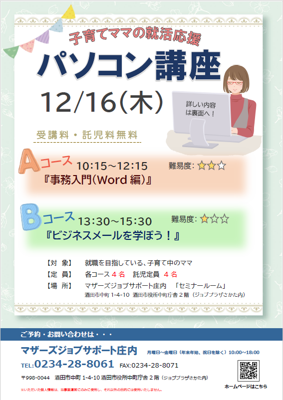 ☆マザーズジョブサポート庄内主催☆再就職応援『パソコン講座』のお知らせ ◇12月◇≪Aコース≫ 12月16日(木)10:15〜12:15『事務入門(Word編)』事務のお仕事にも、一般・経理・労務など様々です。それぞれどのようなパソコン作業があるのかを確認していきます。実際にWordを使って、ビジネス文書を作成し、印刷まで行います。 ≪Bコース≫ 12月16日(木)13:30〜15:30『ビジネスメールを学ぼう!』ビジネスメールの基本やマナーを、実際に操作しながら学ぶことができます。仕事がスムーズに進むメールの書き方など、ビジネス上の様々なシーンで役立つ内容をお伝えします。 ♪片方のコースのみ、両方のコース、どちらの受講でも可能です♪※本セミナーは「雇用保険受給中の求職活動実績」として認められます。 ★★受講者の皆様へお願い★★新型コロナウイルス拡大防止のため、・入室時の検温・手指の消毒・会場でのマスク着用・距離をとっての対応・定期的な換気にご協力お願いいたします。新型コロナウイルス感染症の影響により中止または延期となる場合がございます。あらかじめ、ご了承ください。★★ーーーーーーーーーーーー★★【対 象】就職を目指している子育て中のママ※就職活動前で何かを始めたいママもOK【会 場】マザーズジョブサポート庄内 セミナールーム【料 金】受講料 及び 託児料 無料【定 員】先着4名 ※お申込みが必要です。【託 児】定員4名 ※事前登録・予約が必要です。 託児開室日水・木・金16時まで 登録にお越しください。 【駐車場について】お車でお越しの際は、中町庁舎脇にある〈セントラルホテル契約駐車場〉をご利用ください。(ジョブプラザさかたと表示してあります。)※契約駐車場が満車の場合は、酒田市中央地下駐車場をご利用ください。無料駐車券(最大2時間)を発行いたします。お帰りの際に、コンシェルジュ窓口へお声がけください。 ◇お申込み・お問い合わせ◇マザーズジョブサポート庄内TEL:0234-28-8061メールでのお申込みはコチラ