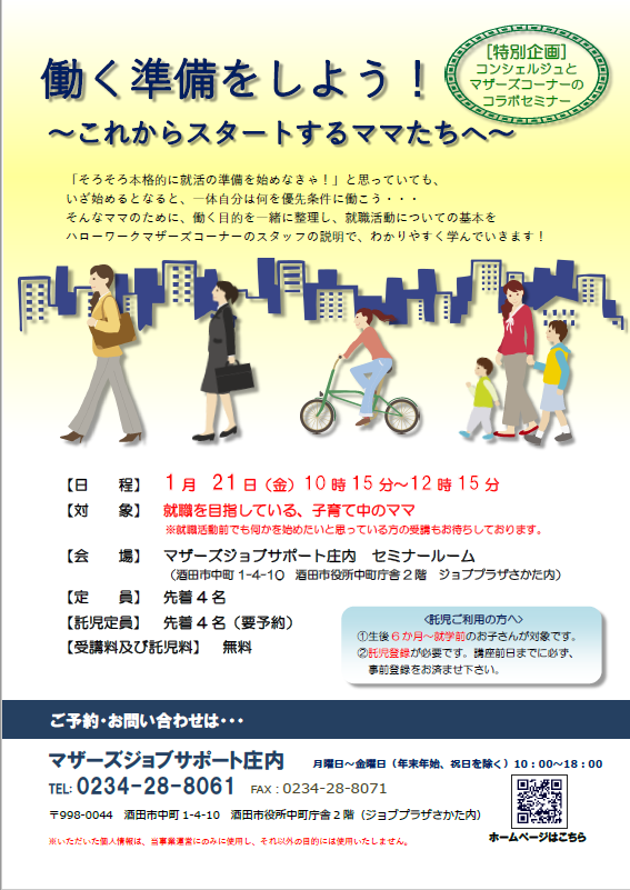 ☆コンシェルジュ& マザーズコーナーコラボセミナー☆『働く準備をしよう!〜これからスタートするママたちへ〜』のお知らせです。☆1月13日追記☆ まだ空きがあります。 ご希望の方、 連絡お待ちしております!「そろそろ本格的に就活の準備始めなきゃ!」と思っていても、自分の働く際の優先順位って…?など悩むことも多いはず。 そんなママのために働く目的を一緒に整理し就職活動の基本をハローワークマザーズコーナーのスタッフの説明でわかりやすく学ぶことができます。 【日 時】1月21(金)10時15分〜12時15分【対 象】就職を目指している子育て中のママ※就職活動前で何かを始めたい方でもOK【会 場】マザーズジョブサポート庄内 セミナールーム【料 金】受講料 及び 託児料 無料【定 員】先着4名 ※お申込みが必要です。【託 児】定員4名※事前登録・予約が必要です。 保育ルーム開室日、水・木・金の 16:00まで登録にお越し下さい。※併設の保育ルームで、保育スタッフが お子さんをお預かりします。 ママは安心して受講いただけます。 【駐車場について】お車でお越しの際は、中町庁舎脇にある〈セントラルホテル契約駐車場〉をご利用ください。(ジョブプラザさかたと表示してあります。)※契約駐車場が満車の場合は、酒田市中央地下駐車場をご利用ください。ご利用の方は、無料駐車券(最大2時間)を発行いたします。お帰りの際に、コンシェルジュ窓口へお声がけください。 ★★受講者の皆様へお願い★★新型コロナウイルス拡大防止のため、・入室時の検温・手指の消毒・会場でのマスク着用・距離をとっての対応・定期的な換気にご協力お願いいたします。新型コロナウイルス感染症の影響により中止または延期となる場合がございます。あらかじめ、ご了承ください。★★ーーーーーーーーーーーー★★ どうぞ、お気軽にお問い合わせくださいね。 お問合せはマザーズジョブサポート庄内TEL:0234-28-8061メールでのお申込みはコチラ
