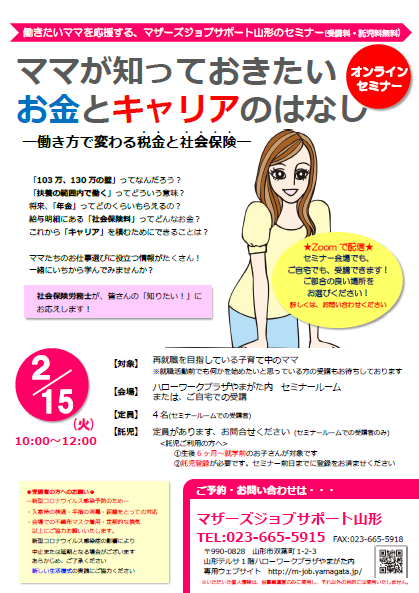 社会保険労務士を講師に招いて行う『ママが知っておきたい お金とキャリアの話』セミナーの、開催のお知らせです。 ・「扶養の範囲内で働く」とは どういうこと?・働くママの「年金」や 「社会保険」はどうなる?・キャリアを積むために 今できることは? これから、自分の働き方を決めるために知っておきたいお金のことについて、キャリアアップできる働き方について、必要な情報をお伝えします。 今月も、オンラインセミナーを@セミナールームで受講する Aご自宅で受講するの、どちらかを選択していただけます!@では託児もご利用いただけますよ☆ ●ご自宅でオンライン受講ご利用の方へ●・インターネット環境が必要になります。 通信料は自己負担です。・パソコン、スマートフォン、 またはタブレットをご準備いただき、 事前にzoom meetingsを ダウンロードしてください。・セミナー中はカメラをオンにし、 お顔の見える状態で受講して下さい。 また、マイクで会話による現状確認ができる形で ご受講をお願いしております。 ☆--- -- -- -- -- -- -- -- -- -- -- -- ---☆ 【日時】 2月15日(火) 10:00〜12:00【講師】 社会保険労務士 高橋 聡子氏 (さと社会保険労務士事務所)【会場】 ハローワークプラザやまがた内セミナールーム または ご自宅でオンライン受講(zoom)【定員】 4名(セミナールームのみ) 【託児定員】 定員があります、お問い合わせください。 (セミナールームで受講の方のみ)【受講料・託児料】 無料 ☆ご自宅にてオンライン受講の方は、 zoom通信料等はご自身負担になります。 ☆--- -- -- -- -- -- -- -- -- -- -- -- ---☆ ●セミナールームご利用の方へお願い●新型コロナウイルス感染予防のため・入室時の検温・手指の消毒・会場でのマスク着用・距離をとっての対応・定期的な換気以上のご協力をお願いいたしますまた、新型コロナウイルスの影響により中止、または延期となる場合がございます。あらかじめご了承ください。 申込み・お問い合わせは…マザーズジョブサポート山形♪TEL:023-665-5915 申し込みはコチラ