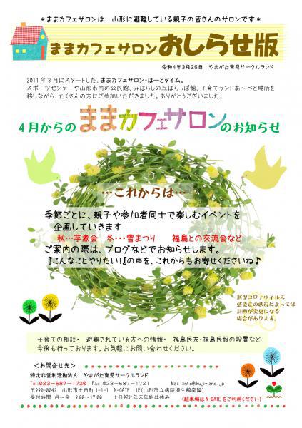 冬の間山のように積った雪も。すっかり溶けてあちこちから緑のかわいい草が顔をのぞかせるようになってきました。桜の開花も近づき、暖かい季節の春が楽しみですね♪ 今回のおたよりでお知らせしておりますが、4月からのままカフェサロンは、季節ごとのイベント開催とを計画しております。こちらのブログを中心にご案内をいたしますので、よろしくお願いいたします。