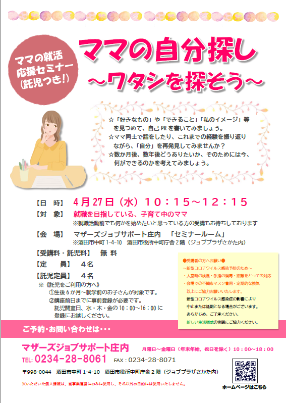 ☆マザーズジョブサポート庄内主催☆『ママの自分探し〜ワタシを探そう〜』のお知らせです。 自分自身のことを理解することからお仕事探しはスタートします。得意なこと、苦手なこと、長所と短所など、自分の棚卸しをして、「ワタシをアピールできること」を見つけましょう 【日 時】4月27日(水)10時15分〜12時15分 【対 象】就職を目指している子育て中のママ※就職活動前で何かを始めたい方でもOK【会 場】マザーズジョブサポート庄内 セミナールーム【料 金】受講料 及び 託児料 無料【定 員】先着4名 ※お申込みが必要です。【託 児】定員4名 ※事前登録・予約が必要です。 保育ルーム開室日【水・木・金】の 10:00〜16:00に登録にお越し下さい。 ※併設の保育ルームで、保育スタッフが お子さんをお預かりします。 ママは安心して受講いただけます。※本セミナーは「雇用保険受給中の 求職活動実績」として認められます。 【駐車場について】お車でお越しの際は、中町庁舎脇にあるセントラルホテル契約駐車場をご利用ください。(ジョブプラザさかたと表示してあります。)※契約駐車場が満車の場合は、 酒田市中央地下駐車場をご利用ください。 無料駐車券(最大2時間)を発行いたします。 ★★受講者の皆様へお願い★★〜新型コロナウイルス感染予防のため〜・入室時の検温・手指の消毒・距離をとっての対応・会場での不織布マスク着用・定期的な換気 以上にご協力お願いいたします。 新型コロナウイルス感染症の影響により 中止または延期となる場合がございます。 あらかじめ、ご了承ください。 新しい生活様式の実践にご協力ください。★★ーーーーーーーーーーーー★★ どうぞ、お気軽にお問い合わせくださいね。 ◇お申込み・お問合せ◇マザーズジョブサポート庄内TEL:0234-28-8061メールでのお申込みはコチラ