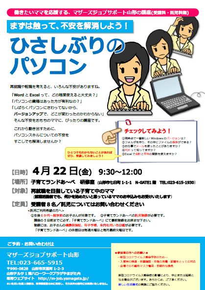 4月のパソコン講座のご案内です。 『まずは触って、不安を解消しよう! ひさしぶりのパソコン』 再就職や転職にむけてこれから動き出すママには不安がいっぱい。「ワードとエクセルって、どのくらい使えると大丈夫なんだろう…?」「パソコンの資格は あった方が有利かな?」「最新のバージョンって、 どのくらい変わったの?」 この講座を受講して、ひさしぶりのパソコンスキルについてそんな不安を解消しましょう!★新型コロナウイルスの感染予防のため 現在山形市内の方のみの受付となります、 ご了承ください。 --------------------------------------- 【日時】4月22日(金)9:30〜12:00【場所】子育てランドあ〜べ研修室【対象】再就職を目指している子育て中のママ 【定員】8名 【託児定員】定員があります。お問合せくだください。【受講料・託児料】無料-------------------------------------- ●ご利用の方へお願い●新型コロナウイルス感染予防のため・入室時の検温・手指の消毒・会場での不織布マスク着用・距離をとっての対応・定期的な換気以上のご協力をお願いいたしますまた、新型コロナウイルス感染症の影響により中止または延期、会場の変更となる場合がございます。あらかじめ、ご了承ください。 お申込み・お問い合わせは・・・マザーズジョブサポート山形♪TEL 023-665-5915メールはコチラまで