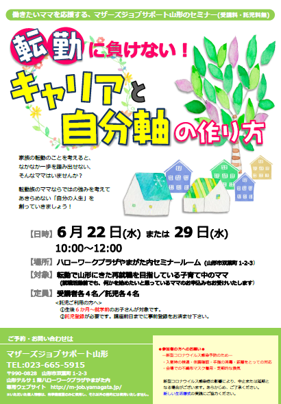 昨年大好評だったセミナー、転勤族のママ必見!今年もやります!『転勤に負けない! キャリアと自分軸の作り方』開催のお知らせです☆ 家族の転勤の事を考えるとなかなか就職への一歩が踏み出せない……そんなママはいませんか? 就職してもまたすぐに転勤になったらどうしよう。転勤のたびに転職、これでも大丈夫?! これからもまた、あるかもしれない転勤をハッピーに捉えられるようにブレない自分軸を、見つめ直してみませんか?あきらめない「自分の人生」を創っていきましょう!☆--- -- -- -- -- -- -- -- -- -- -- -- ☆【日時】6月22日(水) または 6月29日(水)10:00〜12:00【場所】ハローワークプラザやまがた内セミナールーム【定員】4名【託児】定員があります。お気軽にお問い合わせください♪☆--- -- -- -- -- -- -- -- -- -- -- -- -- -- ---☆ ●ご利用の方へお願い●新型コロナウイルス感染予防のため・入室時の検温・手指の消毒・会場でのマスク着用・距離をとっての対応・定期的な換気以上のご協力をお願いいたしますまた、新型コロナウイルスの影響により中止、または延期となる場合がございます。あらかじめご了承ください。 その他、何か気になる事、わからない事などありましたらお気軽にご連絡ください お問い合わせは…マザーズジョブサポート山形コンシェルジュコーナーTEL:023-665-5915メールはコチラ