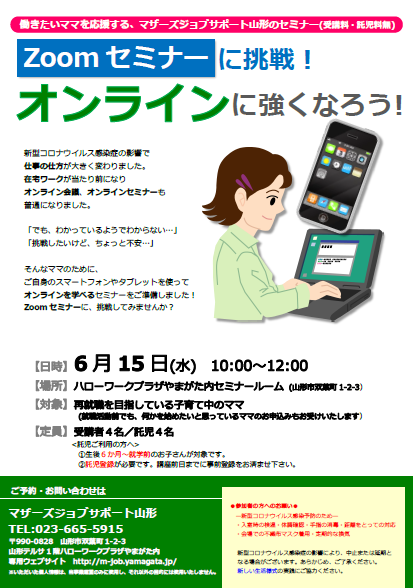 zoomに挑戦!オンラインに強くなろう! 開催のお知らせです! 新型コロナウイルス感染症の影響で今までの仕事の仕方が大きく変わろうとしています。在宅ワークが増え、当たり前のようにオンライン会議が行われています。買い物もオンラインで。子どもたちの勉強もオンラインで。コンシェルジュセミナーもオンラインでの開催が増えました。 「zoomは知ってる! でも分かっているようで わからない…」「挑戦したいけど、 やったことないし… やり方がわからない… 誰にきいたらいいの?!」 そんなママのために♪ご自身のスマートフォンやパソコンで、体験しながら「オンライン」を学べるセミナーを準備しました!一緒にzoomを使って「オンライン」に強くなりましょう! --------------------------------------------------【日時】6月15日(水)10:00〜12:00 【会場】ハローワークプラザやまがた内セミナールーム【定員】 4名【託児定員】定員がありますお問合せください 【受講料・託児料】無料 ------------------------------------- セミナー内で、ご自身の端末(スマホやタブレット)を使用してzoomを体験していただく場面がございます。zoomアプリをご自宅でインストールし当日、忘れずにお持ちください♪※通信料は自己負担となります。 通信量目安:0.3〜0.5GB程度 ●ご利用の方へお願い●新型コロナウイルス感染予防のため・入室時の検温・手指の消毒・会場でのマスク着用・距離をとっての対応・定期的な換気以上のご協力をお願いいたします 新型コロナウイルスの影響により中止、または延期となる場合がございます。あらかじめご了承ください。 お問い合わせは…マザーズジョブサポート山形 コンシェルジュコーナーTEL:023-665-5915メールはコチラ