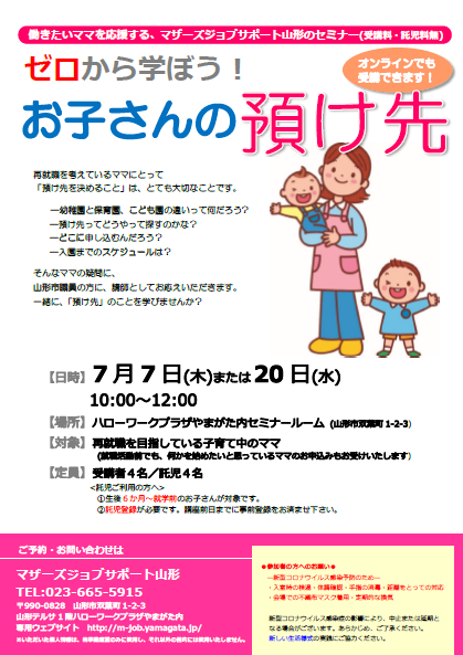 毎年大人気のコンシェルジュセミナー「ゼロから学ぼう! お子さんの預け先」を開催します! 「幼稚園と保育園の違いってなんだろう?」「最近よく聞く「こども園」って?」「入園までのスケジュールは?」 そろそろお子さんを預けて働き始めようか…と考えているママにとって「預け先を決めること」はとっても大切で重要なことです。いろんな疑問を解決して早めに情報を集めましょう!山形市保育育成課の職員が講師としてお話します!(山形市職員がお伝えする情報のため 山形市以外の市町村の内容とは 異なる場合がございます。 ご了承ください。)今年度は、2回開催!両日ともオンライン配信もあります!内容は同じです。都合のいい方をお選びください♪ ----------------------------------------------- 【日時】7月7日(木) または 7月20日(水)10:00〜12:00※都合の良い日をお選びください 内容は同じです★7/7満員御礼! 7/20はまだお申込みいただけます♪【会場】ハローワークプラザやまがた内セミナールーム【定員】各日 4名【託児定員】定員がありますお問合せください 【受講料・託児料】無料 ----------------------------------------------- ●ご利用の方へお願い●新型コロナウイルス感染予防のため・入室時の検温・手指の消毒・会場でのマスク着用・距離をとっての対応・定期的な換気以上のご協力をお願いいたします また、新型コロナウイルスの影響により中止、または延期となる場合がございます。あらかじめご了承ください。 お申込&お問い合わせは…マザーズジョブサポート山形 TEL:023-665-5915メールでのお申し込みはコチラLINEでのお申込みは
