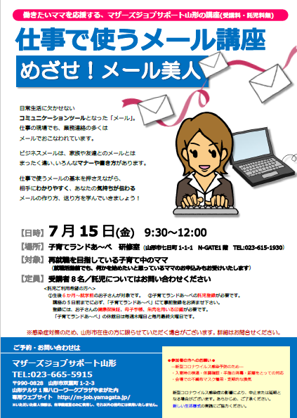 7月のPC講座のお知らせです☆仕事で使う「メール」講座めざせメール美人を開催します。「メール」講座の開催は今年最後になります!どうぞ!お見逃しなく! 仕事上でメールを使ったことはありますか?日頃、家族やお友達とかわしているメールとビジネスメールはまったく違います 仕事をする上で押さえておきたい、ビジネスメールの基本やマナーを学ぶ、再就職応援パソコン講座です 相手にわかりやすくあなたの気持ちが伝わるメールのつくり方を学びましょう! ☆----------------------------------------------☆ 【日程】7月15日(金)9:30〜12:00 【会場】子育てランドあ〜べ 研修室(山形市七日町1-1-1 N-GATE 1階) 【定員】8名 【託児】定員がありますお問合せください 【料金】講座受講料・託児料 ともに無料 ☆----------------------------------------------☆ ●ご利用の方へお願い●新型コロナウイルス感染予防のため・入室時の検温・手指の消毒・会場での不織布マスク着用・距離をとっての対応・定期的な換気以上のご協力をお願いいたします ※新型コロナウイルス感染症の影響により 上記のお知らせの内容が 変更になる場合がございます。 あらかじめご了承ください。 ご興味のある方はお気軽にお問合せくださいね お問合せ先は・・・マザーズジョブサポート山形TEL:023-665-5915またはメールにて