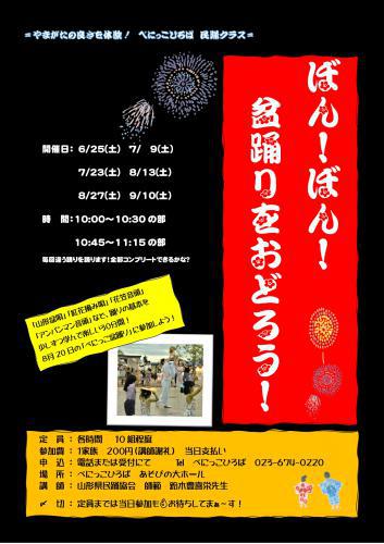 べにっこひろばでは、新たに「べにっこひろば民踊クラス」としてぼん!ぼん!盆踊りをおどろう!が始まります。◇開催日 6/25 7/9 7/23 8/13 8/27 9/10◇時間 10:00〜10:30の部 / 10:45〜11:15の部◇定員 各時間で10組程度◇参加費 1家族200円(講師謝礼) 当日支払い◇申込 電話または受付にて Tel:023-674-0220◇場所 べにっこひろば あそびの大ホール◇講師 山形県民踊協会 師範 鈴木豊喜栄先生※定員までは当日の参加もオッケー!お待ちしてます。