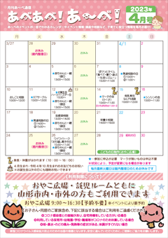 2023年3月24日発行あべあべ!あ〜べ!2023年4月号【PDF版】情報が一目で確認できちゃう『あ〜べカレンダー』は要チェック☆中面の特集は…「あ〜べにおいでよ!」おやこ広場・託児ルーム・各種講座など ご紹介!-------------------------------------------------------------------------【おやこ広場・託児ルームの利用制限】★おやこ広場・託児ルームどちらも 山形市内・市外(県外)の方どなたでもご利用いただけます。★おやこ広場のご予約は不要です。 開館時間9:00〜16:30 ※イベントにより予約の必要なものがあります。お子さん・同居のご家族含め、下記に該当する場合はご利用をご遠慮ください。◎コロナ感染者と接触があり、自宅待機をしている方がいる場合◎家族が利用している保育所・幼稚園・学校・職場等が休業措置の場合◎咳・鼻水・のどの痛み・発熱などの症状がある、体調がすぐれない場合※状況により、変更等があった場合は随時ホームページなどでお知らせいたします。