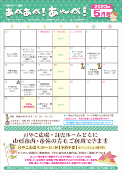 2023年4月15日発行あべあべ!あ〜べ!2023年5月号【PDF版】情報が一目で確認できちゃう『あ〜べカレンダー』は要チェック☆中面の特集は…「知ってる?山形弁」山形ビギナーの方も、ネイティブヤマガタンの方も一緒に楽しもう!-------------------------------------------------------------------------【おやこ広場・託児ルームの利用制限】★おやこ広場・託児ルームどちらも 山形市内・市外(県外)の方どなたでもご利用いただけます。★おやこ広場のご予約は不要です。 開館時間9:00〜16:30 ※イベントにより予約の必要なものがあります。お子さん・同居のご家族含め、下記に該当する場合はご利用をご遠慮ください。◎コロナ感染者と接触があり、自宅待機をしている方がいる場合◎家族が利用している保育所・幼稚園・学校・職場等が休業措置の場合◎咳・鼻水・のどの痛み・発熱などの症状がある、体調がすぐれない場合※状況により、変更等があった場合は随時ホームページなどでお知らせいたします。