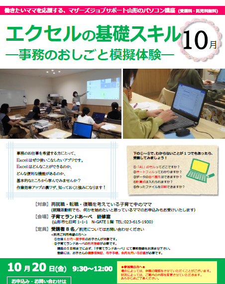 コンシェルジュPC講座「エクセルの基礎スキル ―事務のおしごと模擬体験ー」を開催します! 事務職を希望される方にとってエクセルはぜひ使いこなしたいアプリです。下の@〜Dで、わからないことが1つでもあったら受講してみましょう!@「A1」セルってどこですか?Aオートフィルってわかりますか?Bデータの並べ替えはできますか?C計算式は入れられますか?D作ったファイルを印刷できますか? 作業効率アップの裏ワザ、知っておくと強みになりますよ! 【日時】 10月20日(金) 9:30〜12:00 【会場】 子育てランドあ〜べ 研修室【定員】 8名【託児】 あり お早めにご予約ください【受講料・託児料】 無料 ●ご利用の方へお願い●体調の確認をさせていただく場合がございます。状況によっては、ご案内の内容を変更させていただきます。あらかじめご了承ください。 ご興味のある方はぜひお気軽に、お問合せください♪ お問い合わせは…マザーズジョブサポート山形【コンシェルジュコーナー】TEL:023-665-5915メールはコチラ