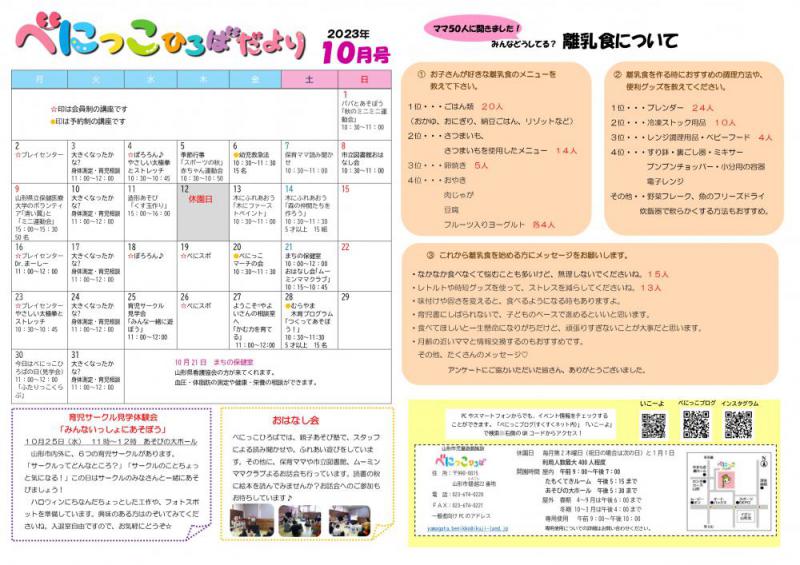 今月は講座やイベントカレンダーの他、アンケート企画〜離乳食について〜を特集しています。ぜひチェックしてくださいね。
