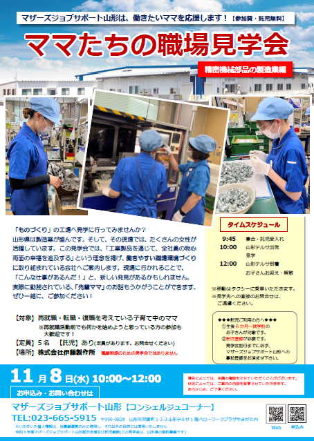 今年度初の「ママたちの職場見学会」開催します♪ 世の中には、いろんな職場があっていろんな仕事があって、いろんな場面でママたちが頑張っています! 日頃、目にすることができない職種のお仕事をその目でご覧になってお仕事探しの参考にしませんか? 第1回目の今回は「精密機械部品の製造業」!ものづくりの工場、気になりませんか?ぜひ一緒に、見学に行ってみましょう!子育てしながら勤務されている「先輩ママ」の経験談も聴けますよ! 【日時】11月8日(水)10:00〜12:00※移動はタクシーに便乗いただきます 【会場】株式会社 伊藤製作所【定員】 5名【託児】 あり【参加料・託児料】無料 ------------------------------------- お問い合わせは…マザーズジョブサポート山形 コンシェルジュコーナーTEL:023-665-5915メールはコチラ