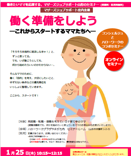 マザーズジョブサポート山形とマザーズジョブサポート庄内の共催!ハローワークマザーズコーナーとのコラボセミナーが実現しました! 「働く準備をしよう―これからスタートするママたちへ―」 @働く目的を考えよう!(コンシェルジュのはなし)・働く目的はなに?・働くにあたっての優先条件は?A就職活動の進め方を知ろう!(ハローワークマザーズコーナーのはなし)・山形県内の雇用状況・マザーズコーナー利用者の就職状況について・就職活動のながれについて(応募から採用まで)・求人票の見方、求職活動のポイントについて ※ハローワークジョブプラザさかたの マザーズコーナーとの コラボセミナーです 就職活動に役立つ情報がたくさん!ぜひ、ご受講ください! 【日時】令和6年1月25日(木)10:15〜12:15【会場】ハローワークプラザやまがた内セミナールーム※オンラインでご自宅での受講もOKです!●ご自宅でオンライン受講ご利用の方へ●・インターネット環境が必要になります。 通信料は自己負担です。・パソコン、スマートフォン、 またはタブレットで受講できます。・スマホまたはタブレットをご利用の方は 事前にZoom meetingsを ダウンロードしてください。・セミナー中はカメラをオンにし、 お顔の見える状態で受講して下さい。 また、マイクで会話による現状確認が できる形でご受講をお願いしております。 【託児定員】セミナールームで受講の方のみ利用できます。お早めにご予約ください。【受講料・託児料】 無料 ●ご利用の方へお願い●体調の確認をさせていただく場合がございます。状況によっては、ご案内の内容を変更させていただきます。あらかじめご了承ください。 申込みメールはコチラ お申込み・お問い合わせは…マザーズジョブサポート山形コンシェルジュコーナーTEL:023-665-5915