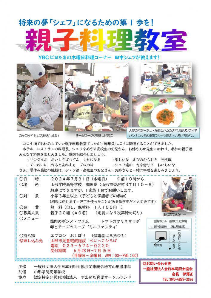 YBCぴよ卵の木曜日料理コーナーの田中シェフや全日本司厨士協会のシェフが先生となり一緒に料理を作ります。 詳細はチラシをご覧ください。