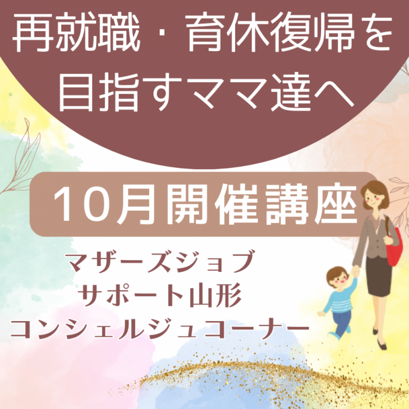 こんにちは!マザーズジョブサポート山形【コンシェルジュコーナー】です♪10月開催のセミナー、講座のお知らせです!★はじめてみよう!保育のお仕事 ★かぞくのじかん ★社労士セミナー ★PC講座 10月は長井にもお邪魔いたします♪★マザーズおしごと相談会in長井 上記の他、窓口相談はもちろん!随時、オンライン相談も受け付けています!なかなか外出できないけど誰かに話したいモヤモヤ相談したいけど、セミナー受けたいけど遠方に住んでいて出かけられない…そんなママはぜひ、オンライン相談をご活用ください♪詳細はコチラ! ぜひ、ママの一歩、お待ちしています♪気になるものがありましたらどうぞ、お気軽にお問合せくださいね! お申込み・お問い合わせは…マザーズジョブサポート山形【コンシェルジュコーナー】TEL:023-665-5915メールはコチラ LINEの友だち登録でいつでも最新の情報をご覧いただけます!☆メール・LINE・電話での対応は 開庁日のみとなります。 日祝・時間外は、返信対応不可 営業再開時間より対応しますので 遅くなります、ご注意ください。