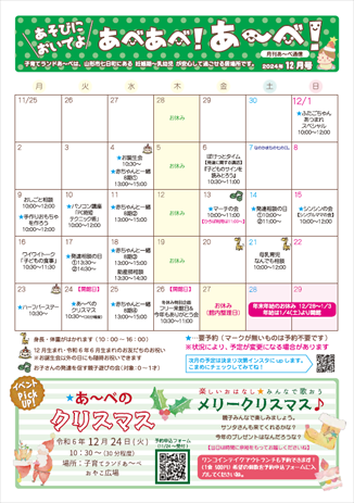 2024年11月15日発行あべあべ!あ〜べ!2024年11月号【PDF版】情報が一目で確認できちゃう『あ〜べカレンダー』は要チェック☆\子育てインフォ/一緒に楽しもう!あ〜べの季節行事四季折々のイベントや館内装飾をご紹介!※状況により、イベントに変更等があった場合は随時ホームページなどでお知らせいたします。【お問い合わせ】子育てランドあ〜べ023-615-1930