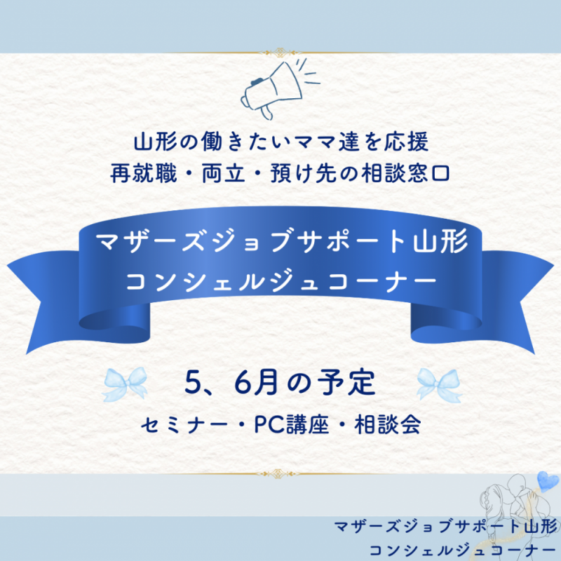 こんにちは!マザーズジョブサポート山形【コンシェルジュコーナー】です♪5、6月開催のセミナー、講座のお知らせです! ☆「自分軸で生きる人生設計」 ☆PC講座「Word講座A」 ☆「働く準備をしよう」 ☆社労士個別相談会 ☆働くママのための心のケアセミナー ☆働くママの基礎知識〜お金とキャリアアップ〜 ☆Excel基礎講座@ ☆マザーズおしごと相談会in米沢 お申込は各チラシ画像をクリックしてリンク先からお願いします定員に限りがあるためお早めにどうぞ!LINEはトーク画面にて「お名前、お申込み講座、託児の有無、お電話番号」を送信して返信をお待ちくださいマザーズジョブサポート山形コンシェルジュコーナーからの返信をもって申込受付完了となります。☆メール・LINE・電話での対応は 開庁日のみとなります。 メール、LINEは開庁時間内で 返信いたします。 出張相談会のご案内------------------------------------------5/14(水) 10:00〜11:30おしごと相談会@べにっこひろばお子さんをひろばで遊ばせながら再就職・両立・預け先のこと気軽に話してくださいね。お待ちしております♪ ------------------------------------------ 上記の他、窓口相談はもちろん!随時、オンライン相談も受け付けています!なかなか外出できないけど誰かに話したいモヤモヤ相談したいけど、セミナー受けたいけど遠方に住んでいて出かけられない…そんなママはぜひ、オンライン相談をご活用ください♪詳細はコチラ! ぜひ、ママの一歩、お待ちしています♪気になるものがありましたらどうぞ、お気軽にお問合せくださいね!お問い合わせマザーズジョブサポート山形【コンシェルジュコーナー】TEL:023-665-5915